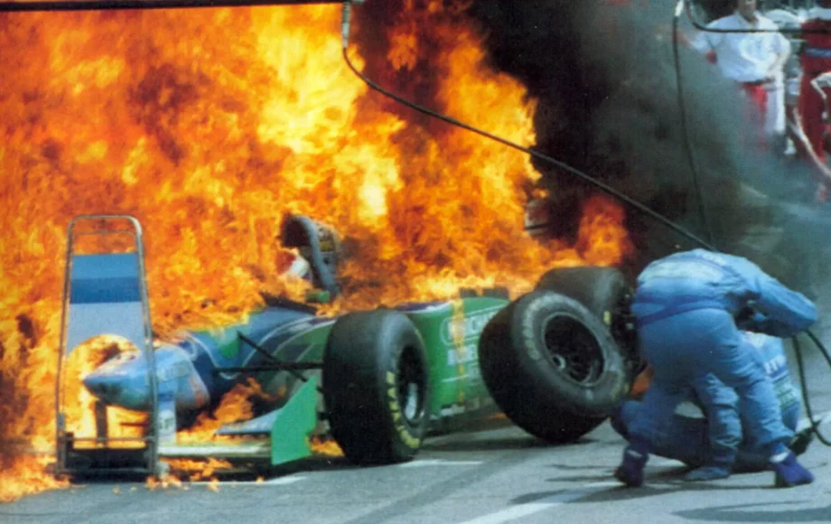 During the 1994 German Grand Prix at Hockenheim, a frightening moment happened for Jos Verstappen and Formula One fans. As the Benetton driver made a routine pit stop, fuel sprayed onto the car and ignited when the crew struggled to attach the refuelling rig. In an instant, the car was engulfed in flames, but marshals quickly extinguished the blaze. Fortunately, Verstappen and the pit crew only suffered minor burns. Gerhard Berger went on to win the race for Ferrari. Only eight cars finished, with French drivers Olivier Panis and Éric Bernard second and third respectively for Ligier.